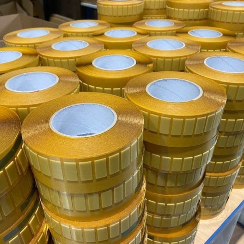 Le procédé de converting de nos rotatives permet d’associer au ruban adhésif 3M™ 4656F un protecteur débordant transparent pour faciliter l’assemblage amovible et une découpe en pastilles.