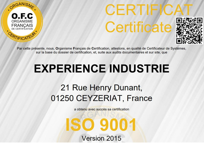 L’entité EXPÉRIENCE INDUSTRIES est en cours d’obtention de la norme IATF 16949.
